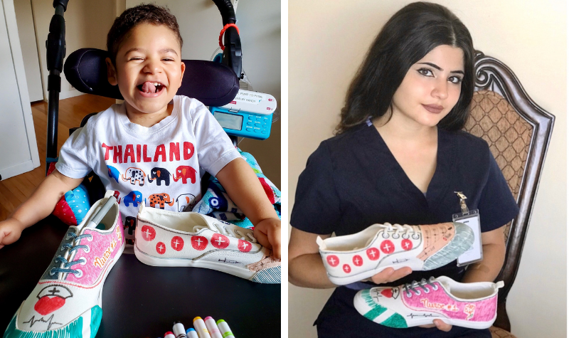 Arthur and his family put this same care and passion into designing her shoes, donated by the Ardene Foundation. “[We put] some hearts and a heartbeat because of Arthur’s heart condition, and some of Shabnam’s favourite colours,” Jennifer shared. They also added nurse supplies, to represent how “fabulous” of a nurse she is!
