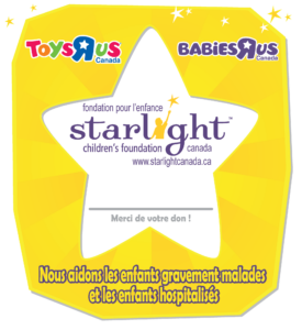Grâce au personnel extraordinaire de Toys”R”Us Canada et de Babies”R”Us Canada, vous pouvez acheter une étoile à la caisse et offrir un sourire à un enfant gravement malade pour 1 $ à peine, à partir d’aujourd’hui et jusqu’au Nouvel An !