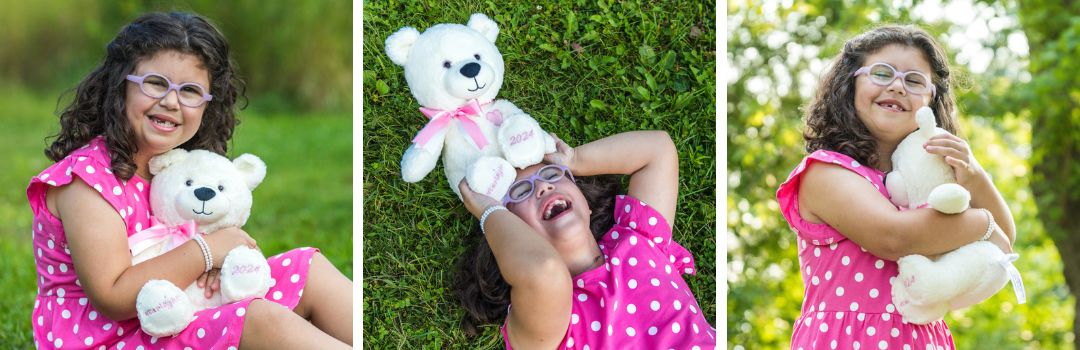 Meet the 16th Anniversary Collectible Starlight Bear, Preshy! Chloe was diagnosed with Williams Syndrome, resulting in several congenital heart defects (CHDs) and 11 other medical conditions. Preshy is inspired by Chloe’s luminous and precious personality, spreading love and kindness wherever she goes! Named after Chloe’s nickname given by her grandmother, Preshy features a pink bow and accents, symbolizing Chloe’s favourite colour and the love, warmth, strength, and compassion she exudes. Preshy’s pink heart patch represents Chloe’s numerous CHD diagnoses and the obstacles she has overcome, never dimming her bright light.