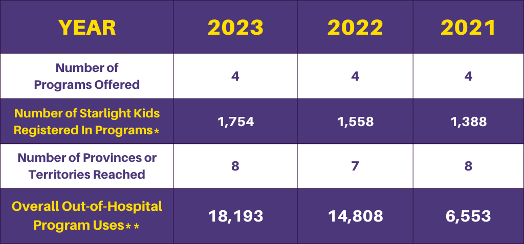 By offering ongoing distraction-based programming for the family as a whole, Starlight Canada creates positive experiences to help improve their mental well-being. Starlight Canada’s out-of-hospital wish programs grant wishes of all sizes to give seriously ill children and their families a reason to smile year-round. Whether they are wishing for a simple night out with a loved one or dreaming big with an ultimate wish of a lifetime, Starlight Canada creates a variety of new opportunities that helps empower children, create rare family-bonding experiences, reduce stress, and increase emotional support. To view an in-depth analysis of Starlight family data trends and demographic information, click here.