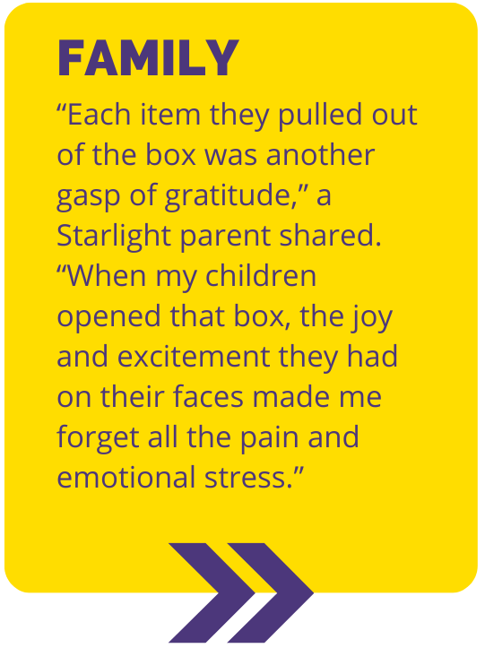 Created for children and teens of all abilities and diagnoses, Play From Home Packs give Starlight families a chance to bond, to laugh, and to find moments of comfort and excitement together, right in their living rooms. They’re a reminder that even in the toughest times, they’re not alone.