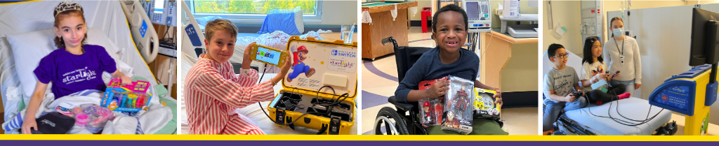 Starlight Canada’s in-hospital programs exist to fill these gaps. From gaming systems like our Starlight Fun Center® and Starlight Handhelds to activity kits such as Starlight Comfort KitsTM and Play From Hospital Shipments, our in-hospital programs provide distraction, relief, and fun for kids and teens who may be nervously awaiting treatment, recovering from surgery, or feeling lonely in their rooms.