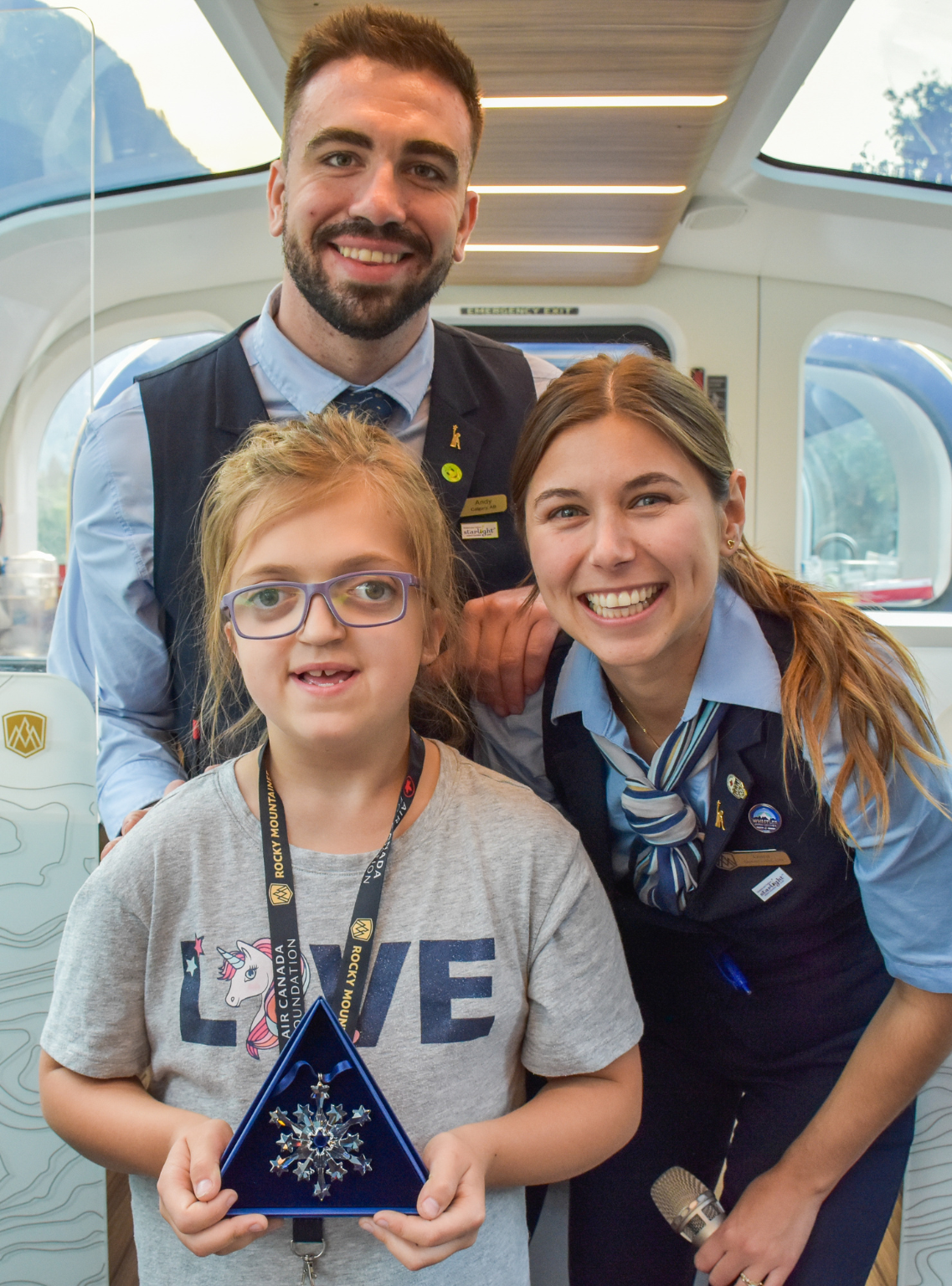 Meanwhile, 9-year-old Emmie from Alberta who lives with a syndrome that affects her facial appearance and causes narrow breathing passages, a high palate, a recessed mid-face, dental misalignment and more, was eager to help train staff in servicing customers onboard. Emmie had the chance to assist in serving food and drink orders, and was recognized by the Rocky Mountaineer team with a Swarovski crystal gift for all her hard work!